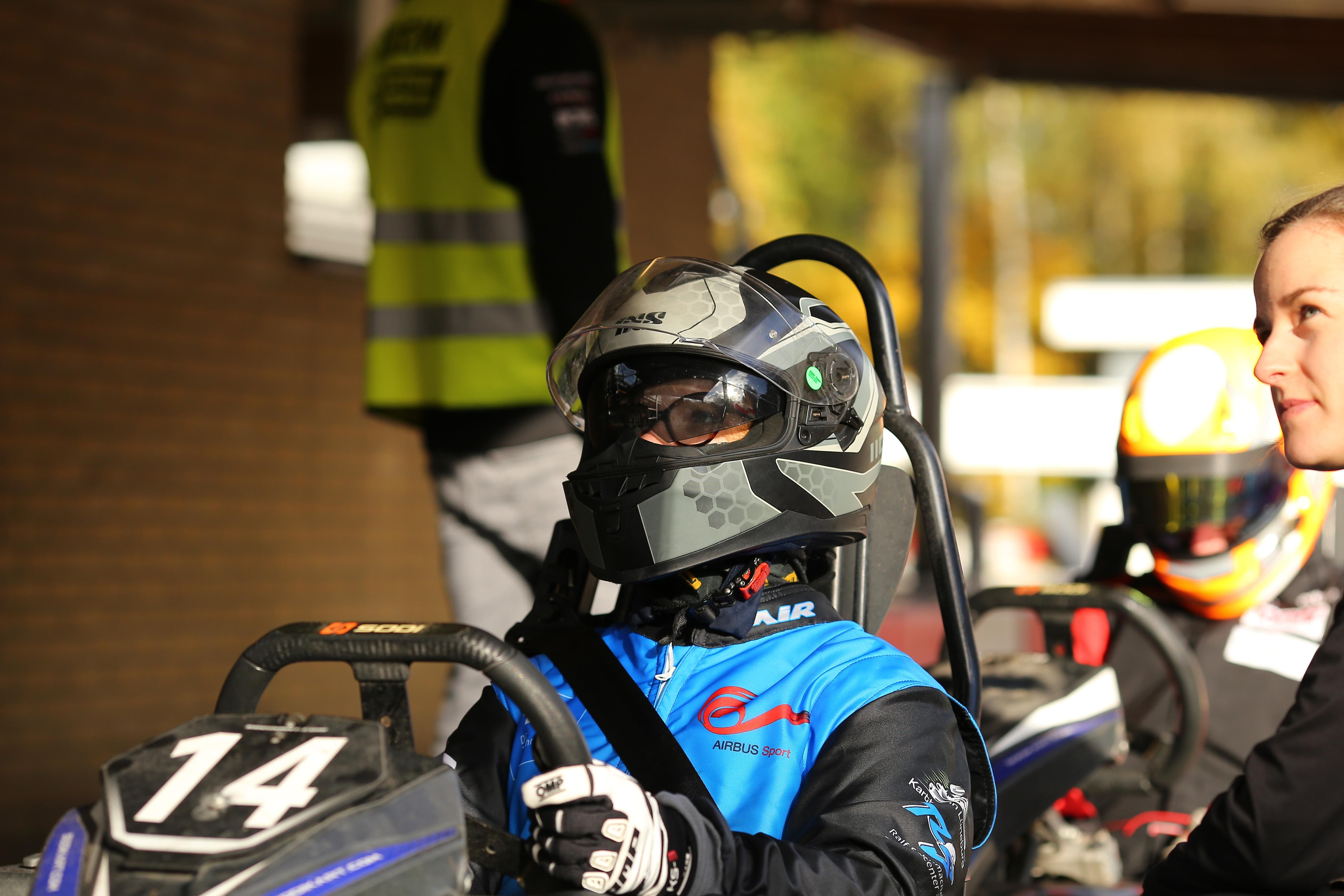 Am Sonntag gingen wir voller Motivation und Vorfreude an den Start. Zuvor gab es eine kurze Fahrerbesprechung. Dort wurden der allgemeine Rennablauf und wichtige Regeln erklärt, zum Beispiel das Mindestfahrergewicht von 85 kg oder die Anzahl der Fahrer- und Kartwechsel. Anschließend stellten sich unsere beiden Teams, Airbus Hamburg 1 und Airbus Hamburg 2, auf ihren Startplätzen auf. Pünktlich um 10 Uhr gingen die Ampeln aus und damit starteten 21 Fahrer in das 12-stündige Rennen. Mit der Zeit verbesserten sich nicht nur die Rundenzeiten. Auch das Wetter wurde besser und die Sonne zeigte sich.