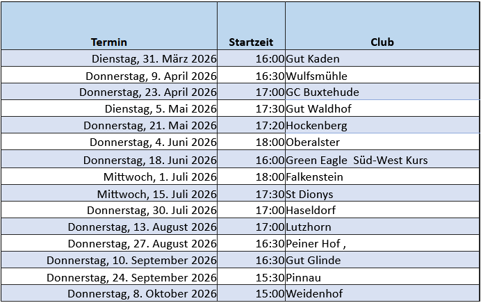 | GC Peiner Hof | 18.07.2026 | 10:00 | Stableford | ??,- Euro | elbe-Sport | Ausschreibung |